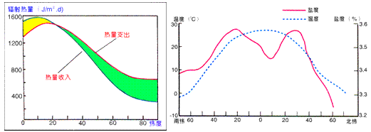 1、海水热量的收入和支出:收入主要是太阳辐射,支出主要是海水的蒸发。收支基本平衡,但不同季节,各个海区收支并不平衡,低纬度海区收入大于支出,中高纬度海区支出大于收入