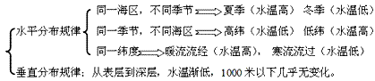空间变化——由低纬向高纬逐渐递减,最高水温出现在北纬7°左右。极圈附近降至0°左右;与同纬度海区相比,有暖流流过的海区,水温高些,有寒流流过的海区,水温要低些。