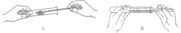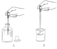 滴管是用来吸取或滴加少量试剂的一种仪器。滴管上部是橡胶乳头,下部是细长尖嘴的玻璃管。使用滴管时,用手指捏紧橡胶乳头,赶出滴管中的空气,然后把滴管伸入试剂瓶中,放开手指,试剂被吸入(如 A图)。取出滴管,把它悬空在容器(如烧杯、试管) 上方(不要接触器壁,以免沾污滴管或造成试剂的污染),然后用拇指和食指轻轻挤橡胶乳头,试剂便滴入容器中(如B图)。