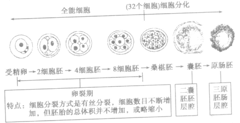 (1)过程:受精卵→卵裂期→桑椹胚→囊胚→原肠胚。