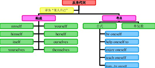 反身代词是oneself 根据所指词的人称、性别、单复数等的变化可以有myself, himself, herself, yourself, itself, ourselves, yourselves, themselves 等形式。