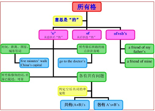 (4)用and连接的并列连词的所有格要分两种情况,即表示各自的所有关系时,要分别在并列连词后加-'s,表示共同的所有关系时,只在最后一个名词后加-'s: