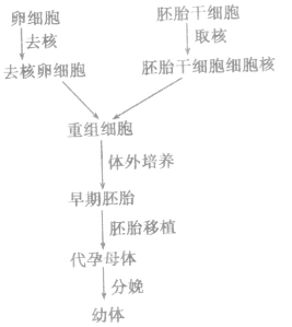 1、将胚胎干细胞核移植到去核的卵细胞中,经过胚激活、胚胎培养、胚胎移植后受体产生克隆动物,操作流程如下: