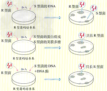 e、实验分析:①只有S型细菌的DNA能使R型细菌发生转化。 ②DNA被水解后不能使R型细菌发生转化。