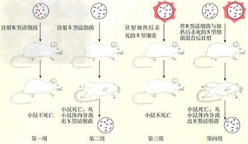 c、实验原理:S型肺炎双球菌使小鼠患败血病死亡;R型肺炎双球菌是无毒性的。