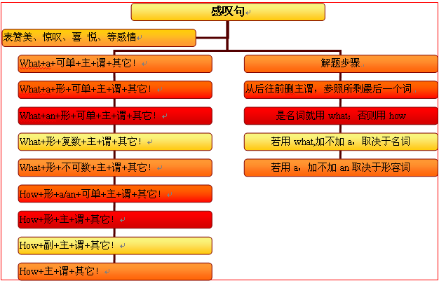 感叹句是表示喜怒哀乐等情感的句子。感叹句一般用how或what开头。How作状语,修饰修饰形容词、副词、或句子。what作定语,修饰名词(名词前可有形容词或冠词)。感叹句要用降调,句末用感叹号。
