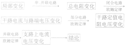 、路端电压U的变化,接着确定干路上定值电阻两端电压的变化,支路上定值电阻中电流的变化,最终确定可变部分的电流、电压等变化情况。由局部到整体,由内部到外部,由干路到支路,层层剥离逐步确定。流程图如下: