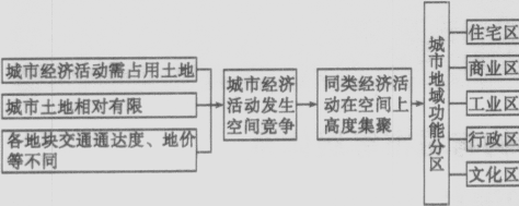 城市的各项经济活动都需要占用一定的土地,由于城市土地面积相对有限,不同地块的交通通达度和地价等也各不相同,因此,各项活动之间必然要发生竞争,并导致同类活动在空间上高度集聚,形成了城市功能区。如图: