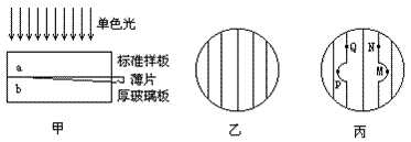 如果被检表面是平的,那么空气层厚度相同的各点就位于一条直线上,产生的干涉条纹就是平行的(如图乙);如果观察到的干涉条纹如图丙所示,A、B处的凹凸情况可以这样分析:由丙图知,P、Q两点位于同一条亮纹上,故甲图中与P、Q对应的位置空气层厚度相同。由于Q位于P的右方(即远离楔尖),如果被检表面是平的,Q处厚度应该比P处大,所以,只有当A处凹陷时才能使P与Q处深度相同。同理可以判断与M对应的B处为凸起。
