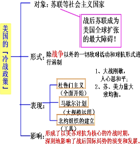 (1)含义:指以美国为首的西方资本主义国家,对苏联等社会主义国家采取的除武装进攻以外的一切敌对行动,以“遏制共产主义”。
