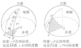 ①当把地球看作一个球时,经线是指球面上从北极到南极的半个大圆.纬线是指垂直于地轴的一组平行平面所截得的圆,纬线除了赤道是大圆外,其余都是小圆.如图所示.