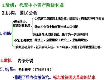 | 雅各宾派 | 1793.6?1794.7 | 中小资产阶级 | 国民公会 | 结束封建制度;实行恐怖政策;全国动员法令 |