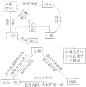 ①责任制内阁简称内阁,内阁的首脑是首相,内阁成员是各部大臣。内阁成员集体负责,必须在大政方针上保持一致,要与首相共进退。