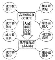 其含义是:城市等级高,城市数目少,相互距离远,服务范围大,城市职能多;城市等级低,城市数目多,相互距离近,服务范围小,城市职能少。不同等级的城市服务范围层层嵌套,大的嵌套小的。