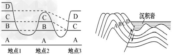 以下图为例,图中A--D表示岩层,且岩层年龄A>B>C>D。