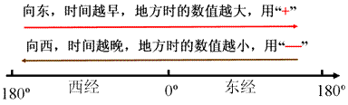 已知某一点时刻,求另一点时刻时,可用数轴法。具体方法如下:把某一条纬线变形为一个数轴,0°为原点,东经度为正值,西经度为负值。把A(已知时间、地点)、B(未知时间、地点)落实在数轴上。无论A、B实际方向关系如何,在数轴上,若B在A东,由A求B就要加;若B在A西,由A求B就要减。