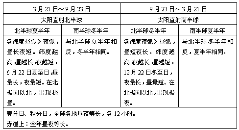 (2)若地球不自转,也不公转,有昼夜现象,但无昼夜交替现象;若地球只公转不自转,既有昼夜现象,也有昼夜交替现象,只不过昼夜交替的周期为一年。