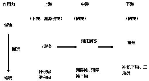 | 下蚀 | 垂直于地面的侵蚀 | 使河床加深,河流向纵深方向发展 |