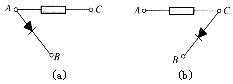 3、用欧姆挡测量,黑表笔接A红表笔接B时测得的阻值较小,反接时测得的阻值较大,说明箱内有一个二极管,可能在AB间,也可能在BC间,如图中两种可能。