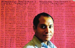 坐在写满五十位温布尔登网球公开赛冠军姓名的红榜前,切斯特·桑托斯凝视镜头,露出自信微笑。