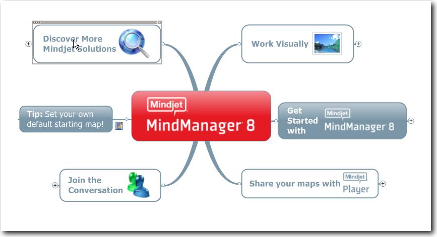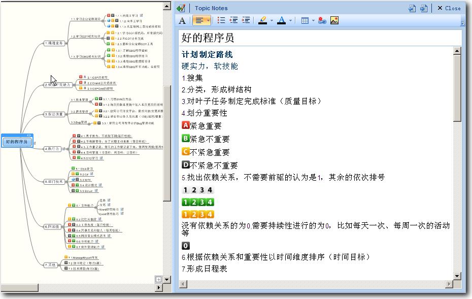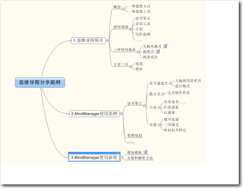 3) 两者结合。先对主题进行大致的划分,在这个过程中可能会有突然的想法,这个想法可能不属于任何的一个主题,先记录下来,在最后再合并和归类。在实际使用中,我们的思考过程应该大部分都是这种。 4.绘制思维导图的工具 需要说明的是,思维导图即是一种工具,也是一种思考方式。思考方式是核心,绘制的工具是次要的。 现在绘制思维导图主要有两种方式: 1) 纸、笔。在网上很多专家都推荐这种方式,使用A3的纸和各种彩笔,进行绘制,花花绿绿挺好看:)据说这种方式才是王道; 2) 使用电脑软件,比如接下来会介绍的MindManager。 两种方式应该各有利弊。使用纸笔能对大脑产生更深刻的印象,能使得左右脑协同作战,缺点是不容易修改,不便于共享,特别当头脑风暴的时候,这种画画的方式可能会跟不上思维的速度。而且受到纸大小的限制,会难以描述细节(很多人认为这是优点,觉得超过1张A3的纸就超出了思维的范围)。 我比较习惯使用软件的方式,因此下面的范例,我采用的是MindManager 8.0来绘制。
