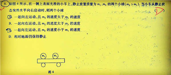 这里有一个问题,是不是学生们把“运动”与“相对运动”搞混了?小车突然向右启动,小球相对于小车会向左运动!学生就把小球当成了向左运动?因此错选了A或者C。如果是这个原因,那一定要明确二者的区别。平时我们所说的物体“运动”是相对于地面!而“相对运动”是指相对于其余参照物!